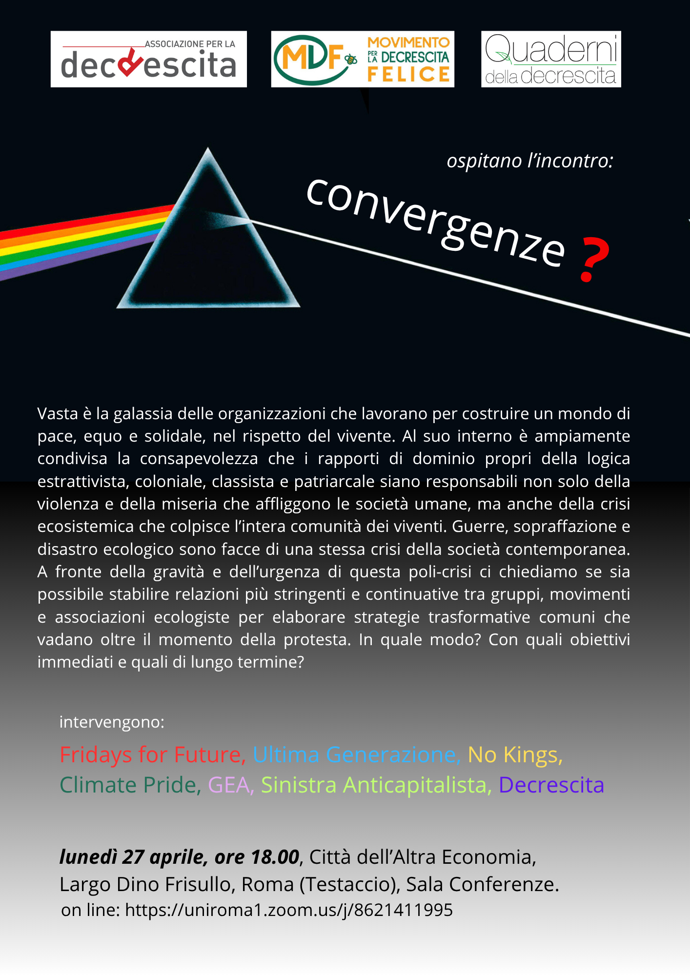 Lunedì 27 aprile alle ore 18.00 si terrà a Roma, presso la Città dell’Altra Economia (Sala Conferenze), l’incontro “Convergenze?”, promosso da realtà impegnate sui temi della giustizia ambientale e sociale.