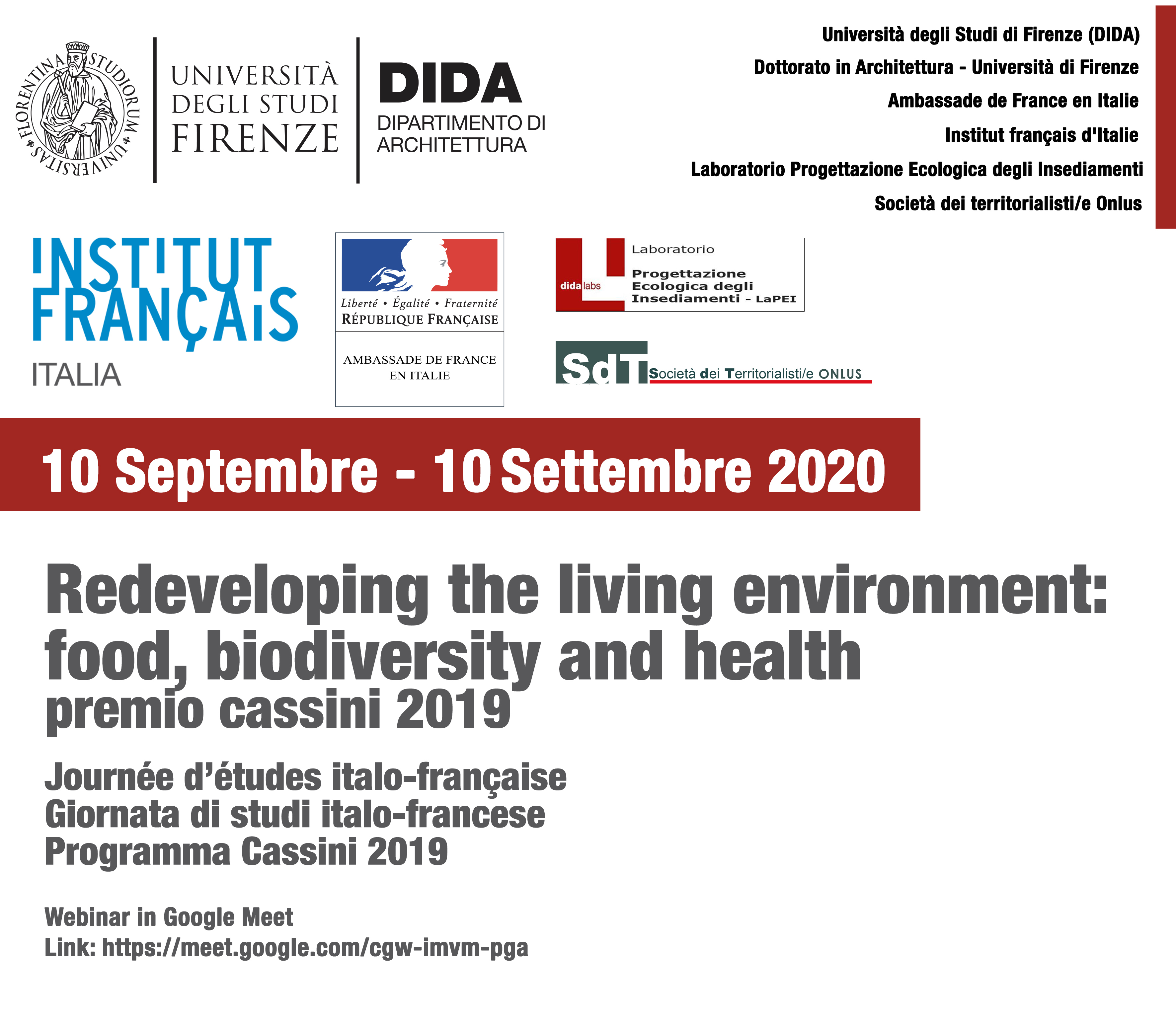 La giornata di studi si svolgerà in formato telematico (su piattaforma Google Meet) il 10 settembre 2020 dalle 9:30 alle 17:00. Sarà in lingua italiana e francese.